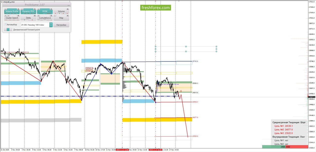 • Среднесрочная тенденция: в шорт. Максимальное скопление объемов среднесрочной тенденции расположено в диапазоне, по котировкам 25460.0–25540.0. В настоящий момент по #NQ100 совершаются инвестиционные операции ниже указанных диапазонов, что говорит о силе продавцов.